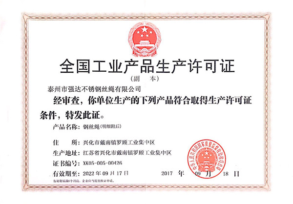 泰州市強達不銹鋼絲繩有限公司位于江蘇興化市戴南經(jīng)濟開發(fā)區(qū),公司致力于不銹鋼絲繩產(chǎn)品生產(chǎn),立志成為“國內(nèi)技術(shù)標(biāo)桿型吊索具生產(chǎn)企業(yè)”。以此戰(zhàn)略思想指導(dǎo),公司堅決貫徹“質(zhì)量贏市場,管理增效益,誠信贏天下”的質(zhì)量方針。以完善的服務(wù)在國內(nèi)不銹鋼絲繩市場樹立良好的品牌形象。公司榮獲“江蘇省質(zhì)量信得過企業(yè)。 靈活的管理機制,經(jīng)驗豐富的